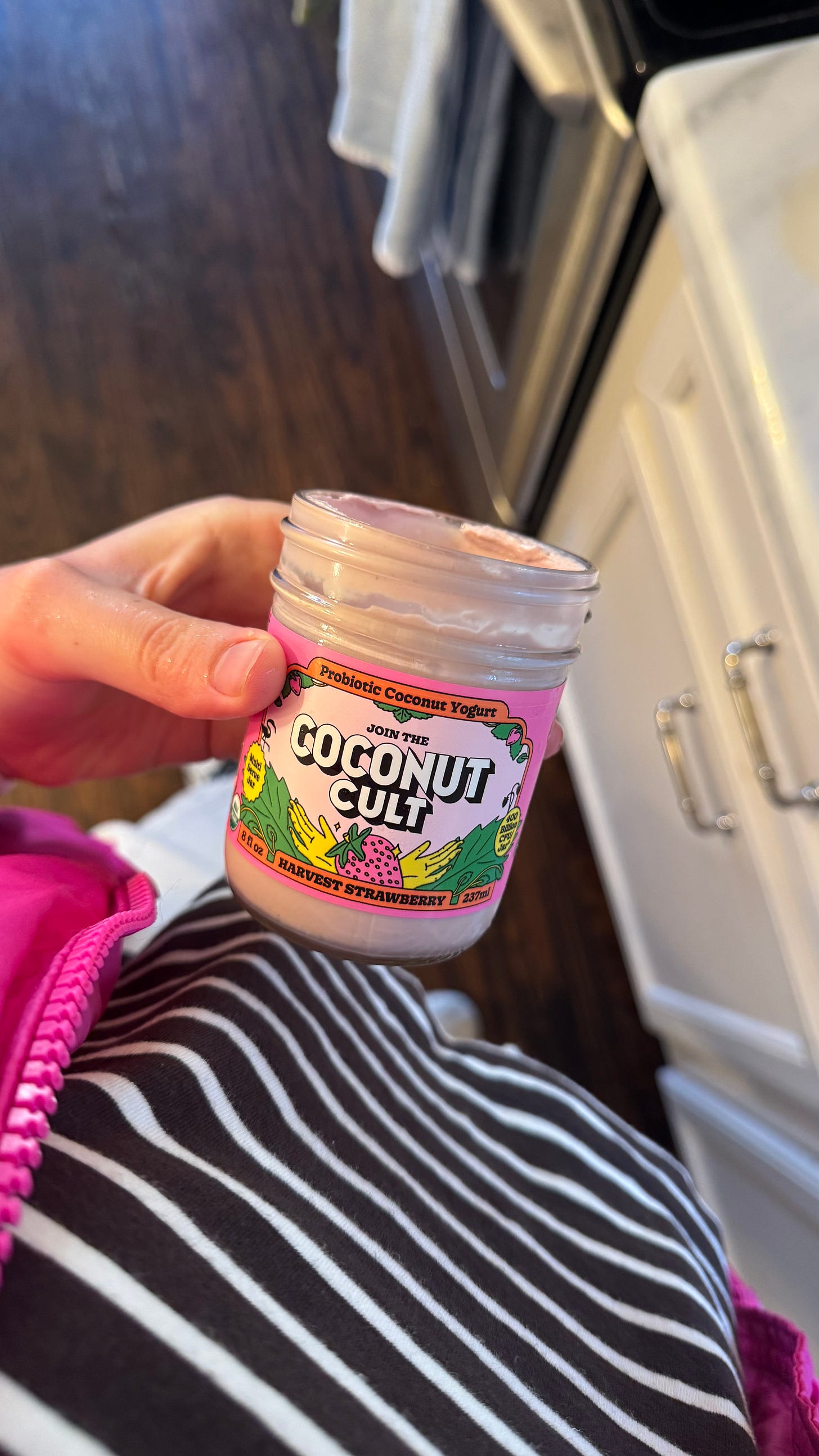 A probiotic, dairy-free yogurt. I eat a spoonful every morning & since I’ve been taking it, I’ve noticed improved digestion. It’s also supposed to help with bloating, but I can’t really speak to that aspect currently (AKA because of baby). You could also take a probiotic for similar effects, but Coconut Cult is much more concentrated. I bounce between the chocolate & strawberry flavors - basically whatever our local health store, Basic Foods, has in stock.